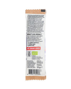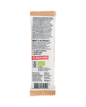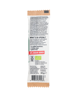 Dietary fibre: inulin*, cocoa mass*, cocoa butter*, skimmed cocoa powder*, sunflower lecithin*, natural vanilla aroma*. (*) from organic origin. May contain traces of soy, nuts, peanuts, and milk.