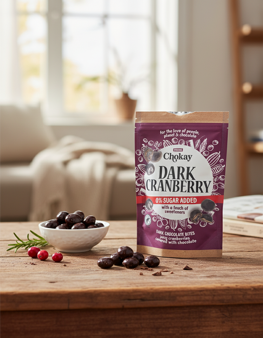 Čokoláda 60 % (kakaová hmota, dietní vláknina: inulin, kakaová hmota, kakaové máslo, sladidla: maltitol, steviol-glykosidy, odtučněný kakaový prášek, emulgátor: lecitin (soja), přírodní aroma), brusinky 40 % (brusinky, koncentrát jablečné šťávy, slunečnicový olej), lešticí látky: arabská guma. Obsah kakaové sušiny: minimálně 52 %. Vyrobeno v závodě zpracovávajícím arašídy, ořechy, mléko a lepek (pšenice).
