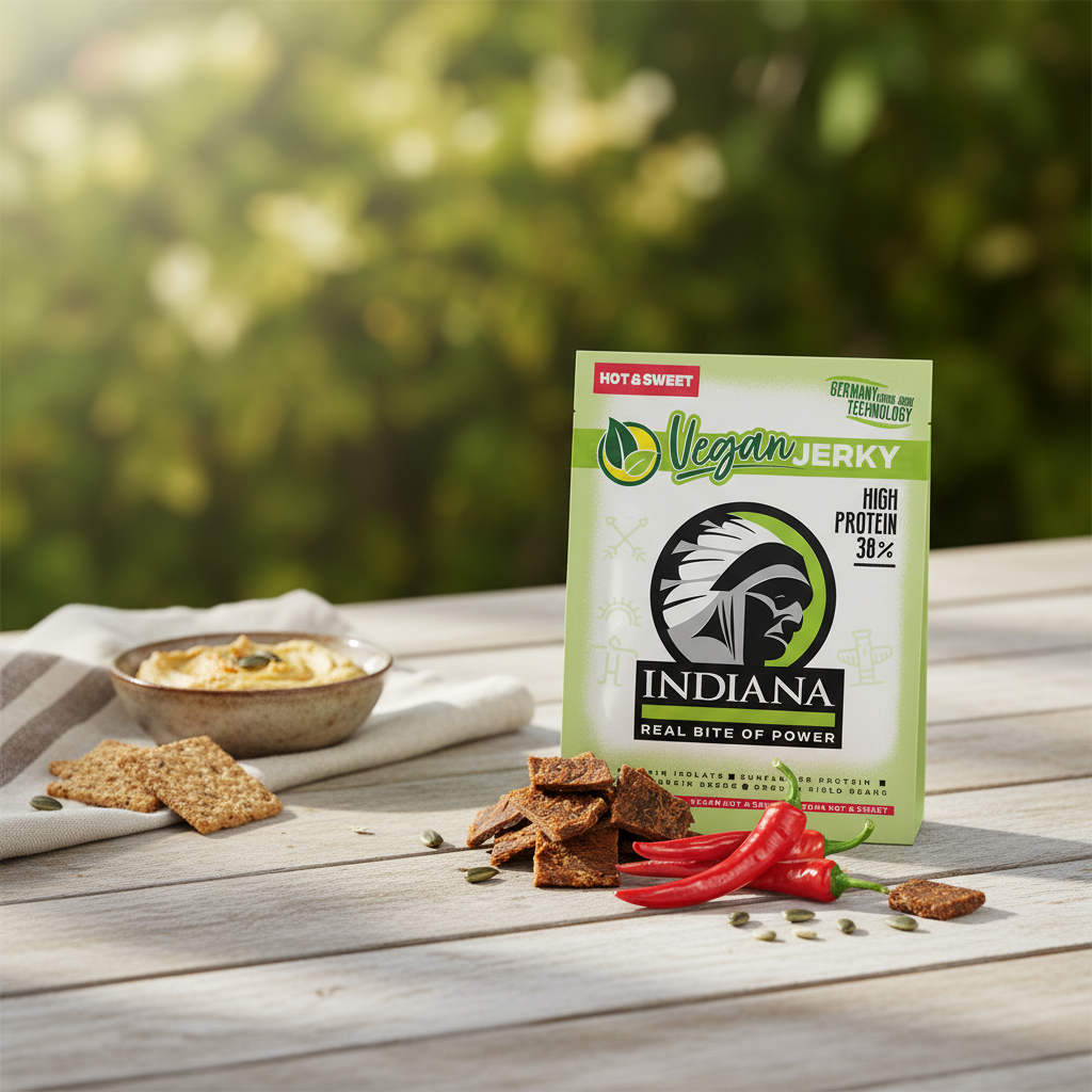 Pea and sunflower protein vegetable alternative to jerky. Ingredients: water, pea proteinisolate (13%), sunflower protein (13%), sugar, ground pumpkin seed (6%), ground fava bean (6%), salt, yeast extract, spices, chilli, bell pepper, dextrose, smoke aroma, garlic, flavouring, onion, humectant: glycerine, tomato paste, caramel, maltodextrin, sunflower oil, SOY PROTEIN HYDROLYSATE (SOYA), wine vinegar. Packed in protective atmosphere. Storage: Do not refrigerate. Consume within 48 hours of opening. Oxygen absorber in packaging is not edible.