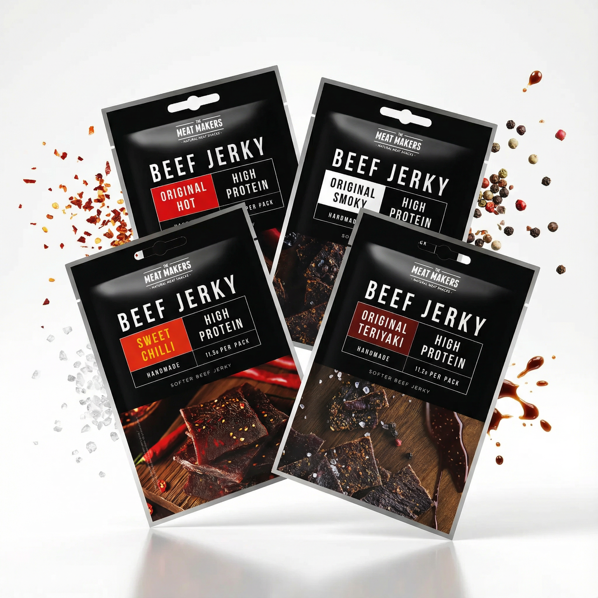 Can’t decide which flavour to try? We’ve got you covered. The Meat Makers Snack Pack Mix brings together four delicious Softer Beef Jerky varieties — each packed with protein, flavour, and adventure. Inside, you’ll find 2x of each flavour: