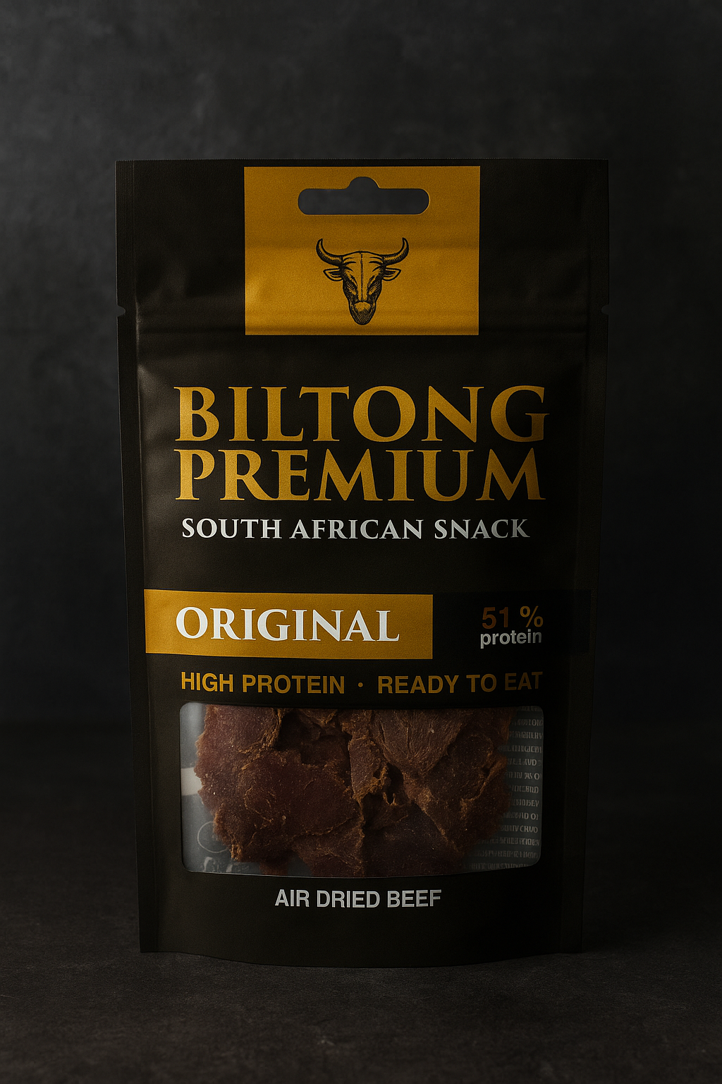 Nasz Premium Original Biltong powstaje ze 100% wysokiej jakości wołowiny, przyprawionej kolendrą, pieprzem i odrobiną octu — zgodnie z autentyczną południowoafrykańską recepturą doskonaloną przez pokolenia. Powoli suszone na powietrzu do perfekcji, zachwyca bogatym, mięsnym smakiem i delikatną teksturą, do której chce się wracać.