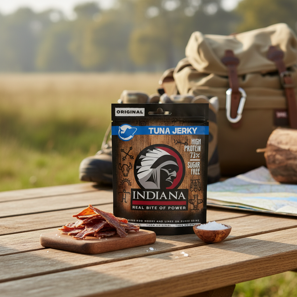 Indiana Jerky gjort av tonfisk! Ett måste för alla fiskälskare eller proteinfantaster. Detta är inte bara ett supergott mellanmål utan har också sensationella näringsvärden med en proteinhalt på 73%. Sockerfri!